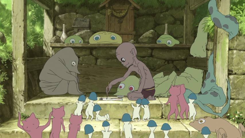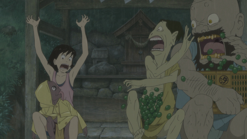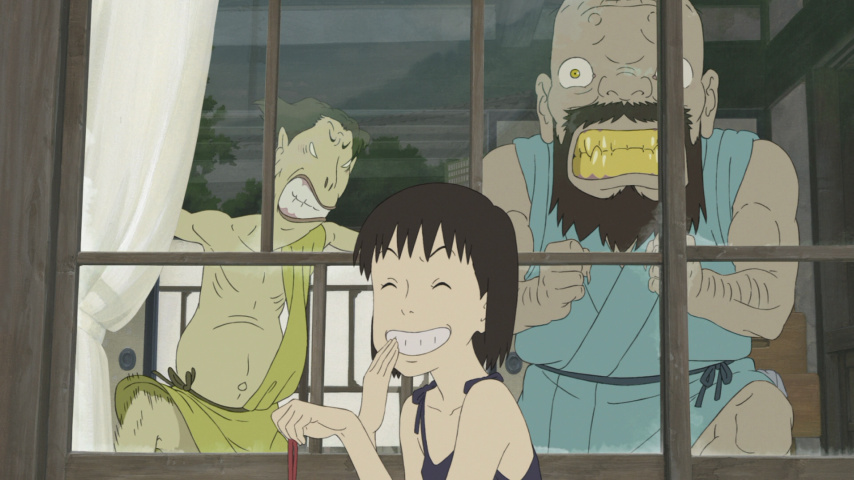 That job, it seems, falls to the ogres. They are a trio of stooges who descend from "Above" — literally — and assume the form of a gang of demonic goons depicted in one of the old books stowed away in her new house's attic. Invisible to others but visible to Momo, they set about insinuating themselves into her life by being grade-A nuisances. They eat the food Momo's mother leaves out for lunch; they steal vegetables from the terraced hillside farms; they find endless ways to drive Momo to distraction. Finally, she gets her hands on their "travel pass" — a magic talisman of sorts — and uses that to blackmail them into not being too unruly.