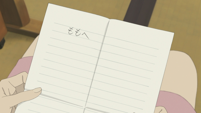 It isn't all that misleading to make comparisons to some of the Ghibli films, actually, since Momo's setup parallels a number of them at once. Momo, a girl of eleven or so, has moved with her mother to one of Japan's more remote islands, a hilly backwater that holds little of interest for someone who just arrived from Tokyo. But Momo's gloom is about more than being displaced; she remains in mourning for her father. He was a marine biologist, seen only in flashbacks as a cheerful man of compulsive work habits, and Momo's last words to him were "I hate you," right before he left on a survey expedition and never returned. All that remains is memories, photos, and one artifact of his — a sheet of paper with the words "Dear Momo" written at the top in his handwriting, and nothing more on the page. She keeps it with her like a talisman to ward off a future that doesn't contain him.