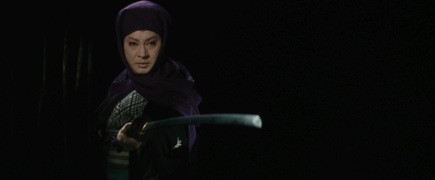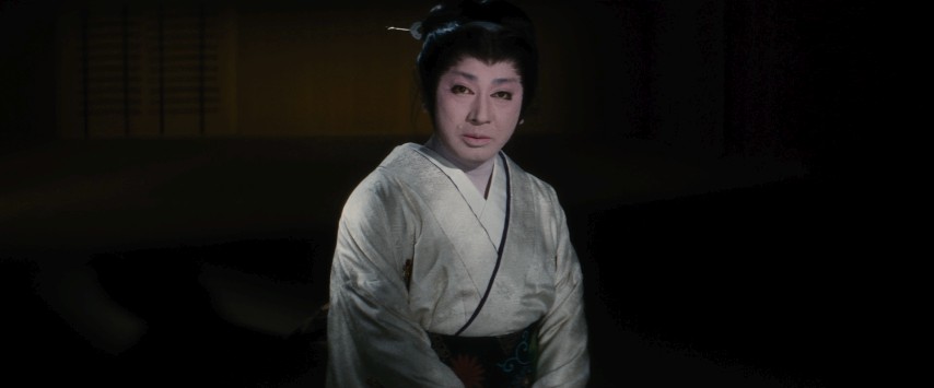 The same could be said of Yukinojō himself, and I think that is the idea. He knows full well how everything in his life has been based on projecting a certain image, from the craft he practices to the deception he's engineering. The fact that few mistake him for "the real thing" is part of what gives his performance its power; it lets him deceive those who don't look very closely, and it lets those who do look closely get far more than they might expect. He's at the other end of the spectrum from, say, Eddie of Funeral Procession Of Roses, whose gender-bending public image was designed to reveal and flout far more than it hid away (at least, that's how it seems at first). It makes sense, then, that the last we hear of Yukinojō is an existential gesture along the lines of the conclusion of La Femme Nikita. Once the last mask is removed, there's nothing left. At least, nothing we in the audience are lucky enough to know about.