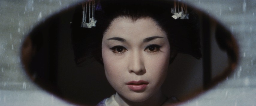 From the stage, amidst fake snowfall, Yukinojō looks out in the direction of the audience and sees two of the men he seeks there: Sansai Dobe, the retired magistrate; Kawaguchiya, the merchant. And Namiji, Sansai Dobe's lovely daughter. But when Yukinojō looks, he sees at first only more snow — as if the theatrical creation he inhabits has become his world, and in turn ours as well. And when he does see the faces of those he longs to revenge himself against, they appear instead as closeups in an oval overlay, the sort of old-school movie technique that now feels timeless instead of dated.