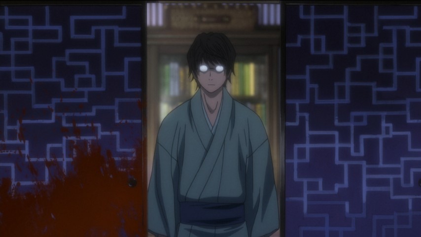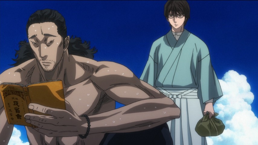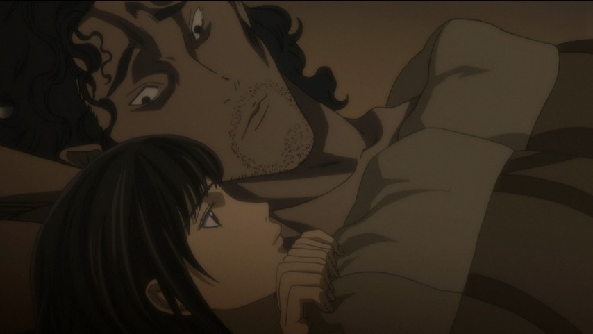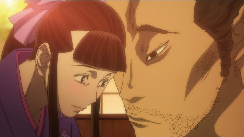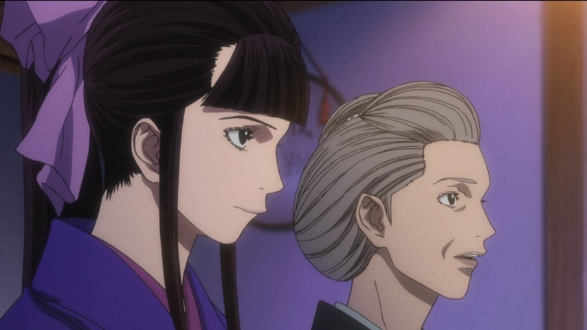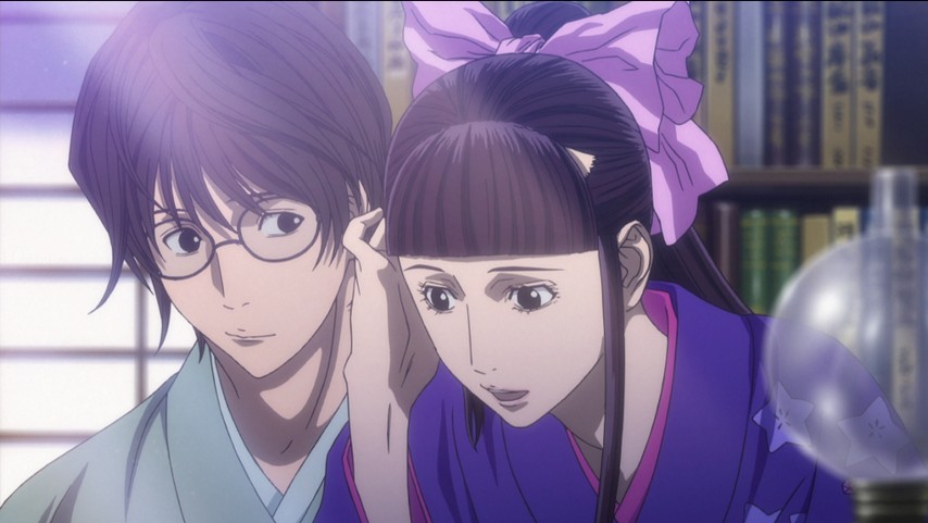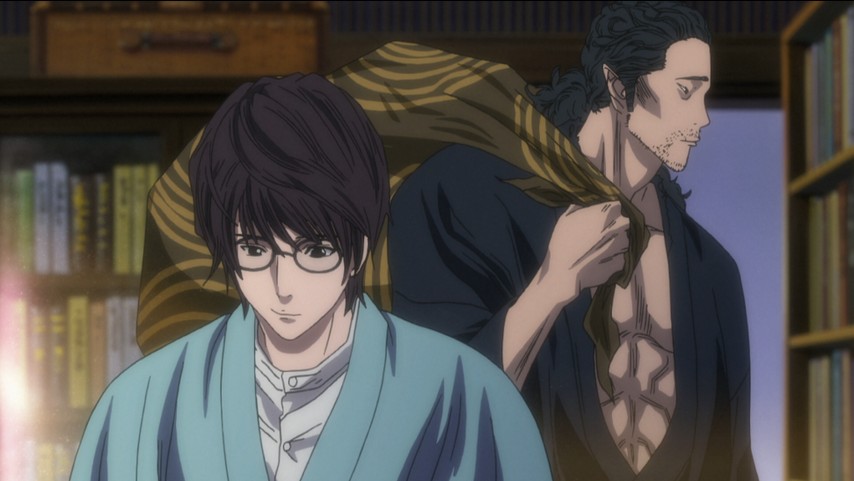 All the action of the second half of the book ends up being compressed into a single half-hour episode, and again, for those familiar with the material this leaves what looks like little room to move forward. Then the second and final episode presents the same material — except from K's point of view, with his reactions and things that only he was privy to visible to us at last. What we saw as insularity and sullenness, we now see as shyness and awkwardness; where before we saw Sensei feeling bullied and ill at ease by K's stolid determination, we see now how Sensei triggered that by way of his own high-handedness. And it's hard to find fault with the craftsmanship applied to this "both sides now" approach; the tension that arises not once but twice across this storyline is impressive.