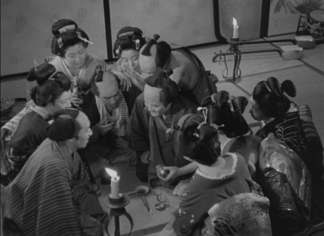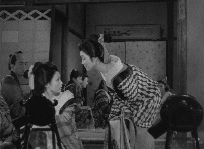 As with any house like this, there's endless rivalry between the top two geisha, Osome (Sachiko Hidari) and Koharu (Yōko Minamida), but this isn't a case of fallen purity versus cynical evil. Both of them are haughty and grasping, just in different ways, and to great comic effect: Koharu tricks both a father and son into signing wedding pledges to her; Osome tries to indulge in a love suicide with a poxy dealer in dirty books. Neither one ends well, but the movie regards them both with affection and not contempt — especially through the way Saheiji winds up becoming instrumental in helping both of them out. (Although the way that happens, especially in Kokaru's case, is itself a laugh riot.)