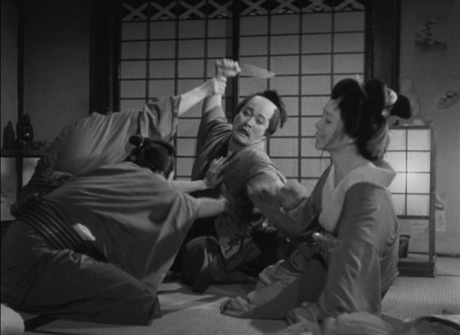 It's been said one of the hallmarks of a great chef is how good they are at making nothing more than an omelet. The same goes for a director: if they can just film two people in a room together in a way that captivates the eye, that's genius. There's not a single scene in Bakumatsu Taiyōden that wasn't staged and executed with great creativity, and the best part is how we only tend to realize that after the fact because it's woven so effortlessly into the actual storytelling. At one point when Koharu and Osome needle each other, it explodes into a fantastically choreographed cat-fight that spans multiple floors of the building and employs a whole slew of props. But it's propelled by the actors and the drama, not the camera. (Hideo Gosha tried to do something similar in his own movie The Geisha, but only ended up delivering something unintentionally funny, and not even all that visually interesting.)