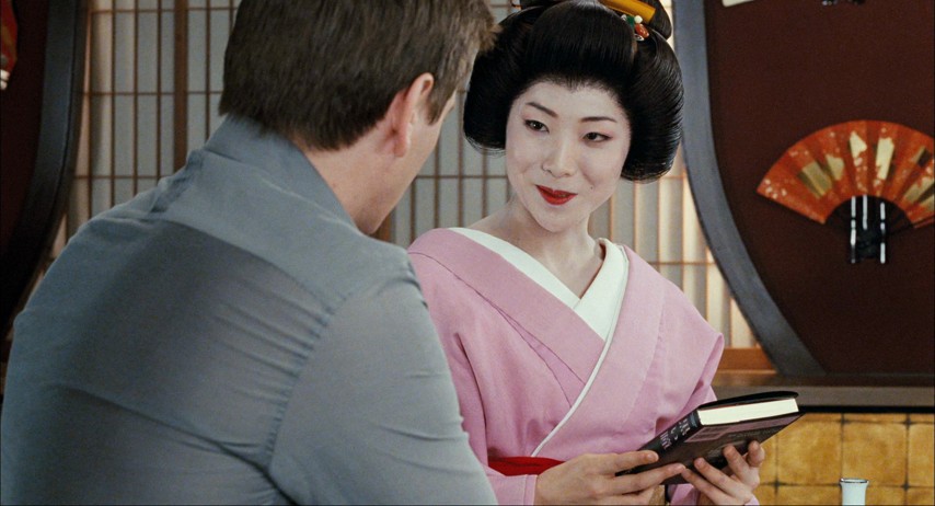 Then Tamao (Lika Minamoto) enters the picture, a geisha working at one of the houses where Alex gets entertained by his Japanese publishers. She's convinced only Alex can help her, as she believes an old boyfriend, obsessed by her, is Oe, and is now preparing to cinch a noose around her neck. Of course Alex can't say no to helping her, and before long that shades over into full-blown, uh, "involvement".