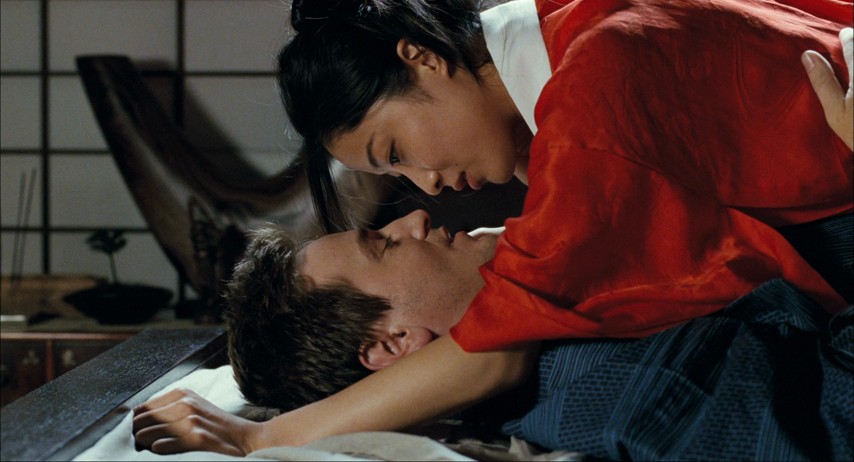 The other modification to the story, Westernizing the hero, is even more misguided, because it involves another gratuitous modification to the original. In the original, the woman ("Shizuko" as she was called) was just an elegantly dressed woman of mystery. Here, Tamao, as she's now known, is a geisha, the embodiment of countless Western fetishes about Japanese women. The idea, I guess, is to make Tamao a seductive figure in a way that non-Japanese audiences can relate to, and to Schroeder's credit he goes to some length to make geisha-dom a major and well-annotated part of Tamao's life. But the end result still feels like Westernized Asia-sleaze, leading to embarrassing scenes where Tamao sucks on Alex's toes and instead of it being sexy all we can think is, hope she brought some mints for after.