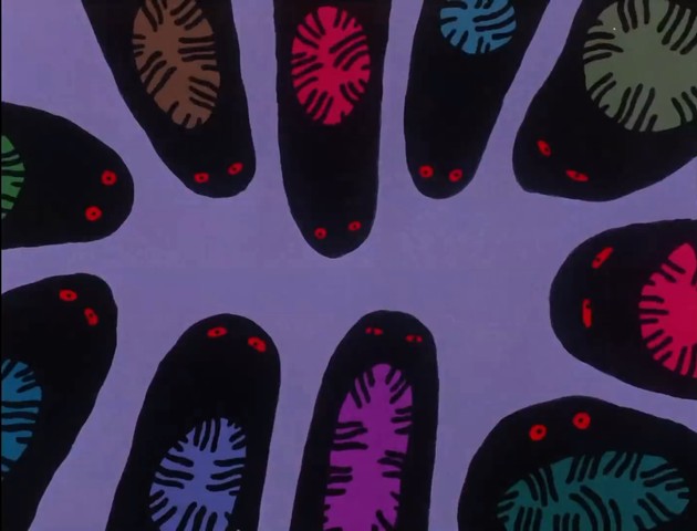 When the movie doesn't work, it's not because it pushes too far; it's in all the moments when it pushes in directions that seem just plain irrelevant. One of the chief aesthetic influences Yamamoto cited for the making of Belladonna was Yellow Submarine, and ironically enough the sequences composed as clear homage to that film seemed the most dated. When the Black Plague shows up, it's in the form of anthropomorphic microbes resembling escapees from a bad educational film of the period. (Maybe they're parodying that?) When Jeanne finally consummates her full union with Satan, there's a flood of parodic, cartoonish, and modern-day Pop Art images that are all but impossible to relate back to the film as a whole. Fun as these things are to watch, they're an indulgence, and I felt they constituted a bigger aesthetic misstep than any of the scenes of brutal sexuality — at least those did have something to do with the story.