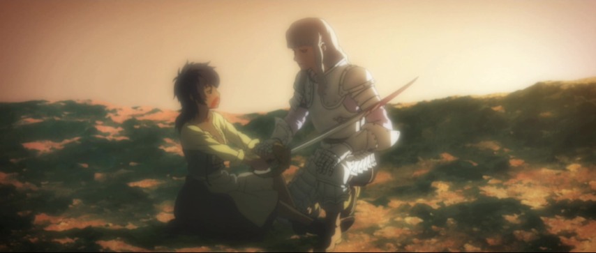 Berserk 1.0's stylistic crudeness works more for it than against it on a thematic level, too. The ugliness and moral squalor of the story — which, again, are the point — contrast all the more against its moments of tenderness and beauty because of that. If you create a story about violent characters in violent times, it feels wrong to put too much polish on it — not only because the last thing you want is to make such unpleasant material palatable, but because then people remember only the polish and little else. Here is a story about (among other things) a man so determined to make an empire of his own that he prostitutes himself to one of the very people he's eventually hired to fight. You prettify something like that at your own risk, and to its credit the TV show does nothing of the kind. It stays true to the material in the ways that deserve most to stick with us.