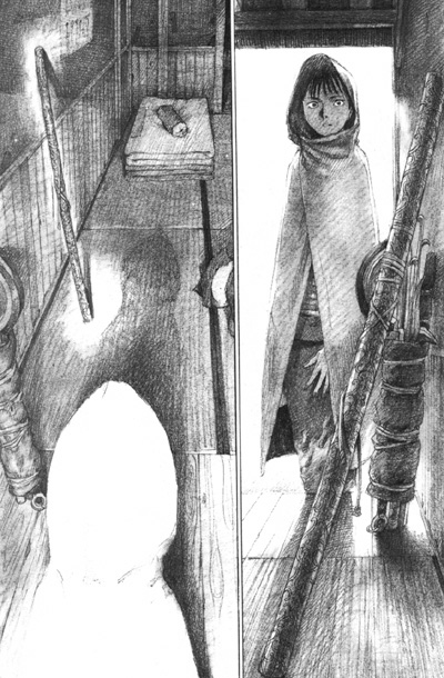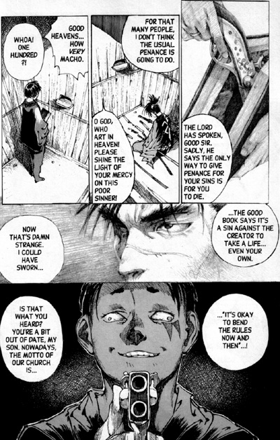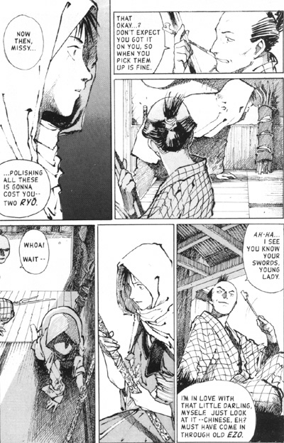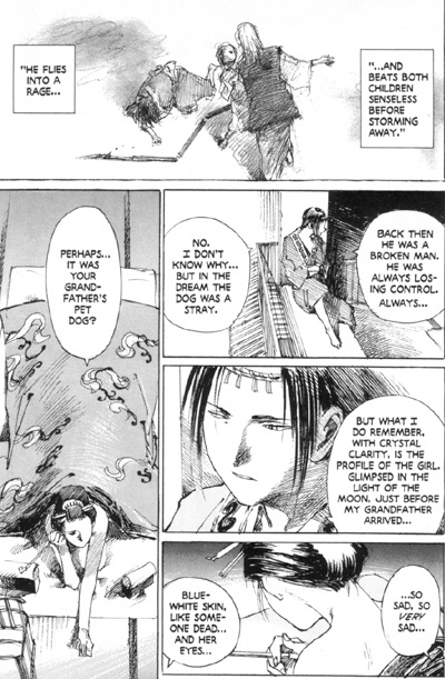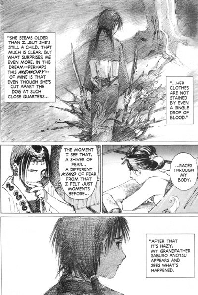 A word about the presentation of the art is in order here. Blade of the Immortal was one of the very first manga to receive broad distribution in English. Right-to-left printing may be ubiquitous now, but it was unheard-of when Blade first appeared in comic shops; the typical strategy was just to print each page as a mirror image. Rather than do this, Samura approved of a plan to have the panels on each page reorganized to read from left to right whenever possible. The reissue preserves that "swapped" layout, and doesn't substitute it for a right-to-left version. At first I was irritated by this; it would have been nice to see the story in its original format, as per Kodansha's forthcoming reissue of Masamune Shirow's original Ghost In The Shell manga. But I suspect it would also have been a major and costly production effort, and it would have run contrary to the original aim of making the title as broadly accessible as possible. It makes little sense to undo that right when the series is poised to draw in an entirely new generation of readers.