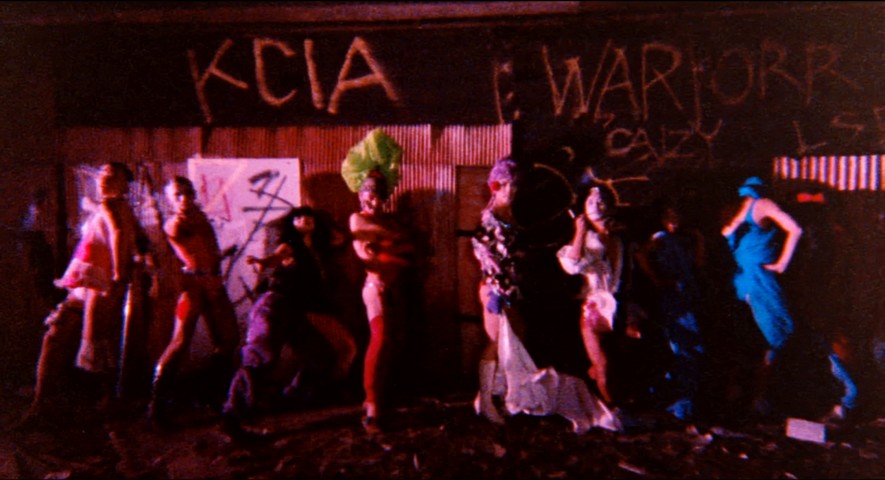 It's essentially silent-film storytelling, the same technique Ishii used years later in Electric Dragon 80.000 V. That movie had more title cards than actual dialogue, but even without them we always knew what was up. Burst City's story is far more hairy than the other movie's simple guy-vs.-guy beat-down plot; most everyone in it is at war with most everyone else in some form. By the two-thirds mark, story's been thrown out the window anyway, in a headlong free-for-all of riotous violence that's so propulsive I feared my monitor might wrench itself loose from its mount and headbutt me. And when it ends, it's not with a whimper or even a bang, but a primal rock'n'roll scream and burning tire rubber. It fits.