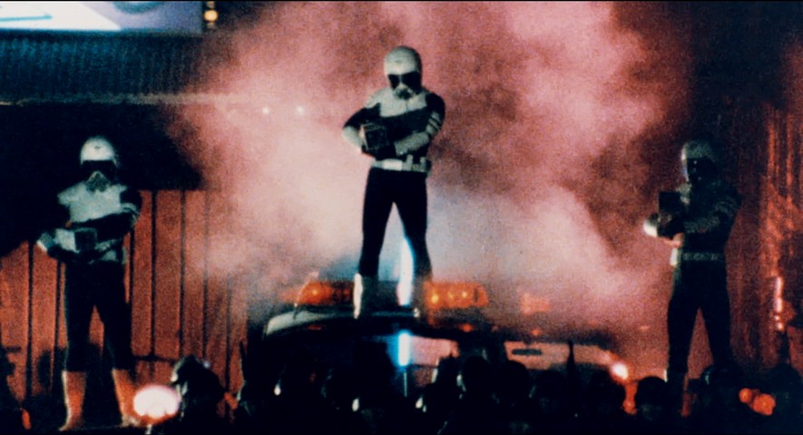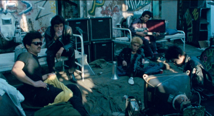 "In my mind, the film is still unfinished," Ishii said, but without regrets. "I had no ambition of creating something perfect. More important was making something that was fast, cool, and a bit of a mess." The "cool" came from the copious counterculture street cred in the film's crew and cast. Aside from then-famous punk outfits like The Stalin, The Rockers, and The Roosters, Ishii also recruited protest-music-idol-turned-actor Shigeru Izumiya as both a key performer and as the film's chief production designer. (For even more of Izumiya's hammered-together production designs, check out his utterly bonkers experimental SF/horror project Death Powder.) Actors from Shuji Terayama's experimental theatrical company appeared alongside extras recruited straight from punk clubs and biker gangs.