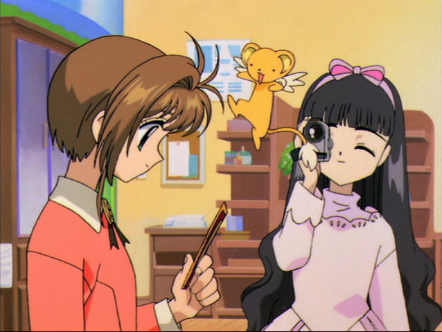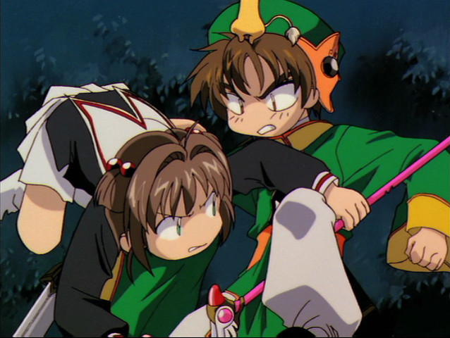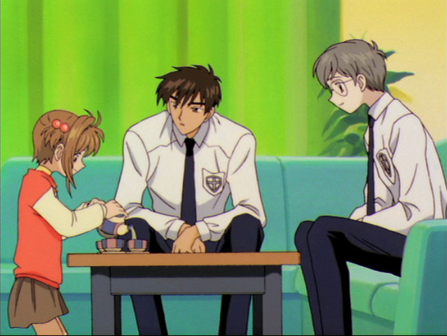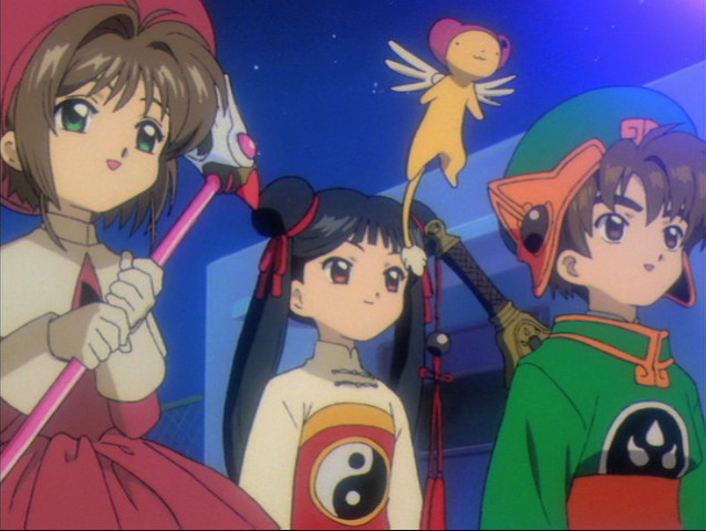 Sakura's quest doesn't just bring her into contact with a slew of cards from the deck, each with their own self-describing power ("The Windy", "The Float", "The Illusion", "The Fight"). It also brings her into contact — and sometimes collusion, and sometimes conflict — with a gallery of other characters. On the collusion side, there's her friend Tomoyo, who uses her apparently bottomless pool of funding to garb Sakura for combat — through this the show makes a running gag out of how she's in a different outfit each time a new card turns up — and film the results for posterity. On the conflict side, there's Li Syaolan, a stern-eyed young man also hunting down the cards, who arrives from abroad and in time goes from a competitor with Sakura to a co-conspirator. The way both Syaolan and Sakura have rival interests for Yukito, a friend of Sakura's brother, becomes an unexpected way to bring Syaolan closer to all them and reveal what another show might consider his weaknesses but which here might be better called his sensitivities.