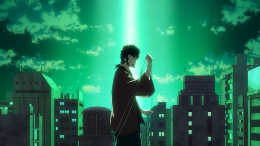 Dimension W — the name should be a giveaway now — describes a near-future where clean energy has been made possible by "Coils", devices that function in much the same way as Asimov's speculation. A multinational corporation, New Tesla, holds the monopoly on Coil manufacture, and is prepared to go to any lengths needed to protect their control over the market. Sometimes that means hiring bounty hunters to find and destroy illegally produced Coils. Kyoma, the protagonist, is one such bounty hunter, a grumpy fellow with an active distaste for anything Coil-powered (he drives an antique gasoline-powered car). The character design hints at how he's a man out of his own time: he affects the dress of a 19th-century laborer (leg windings, a happi coat, etc.), and his weapon of choice is ninja-like throwing shivs. His disgust for Coil tech, as it turns out, is not an affectation; it's eventually explains as being more like a grudge.