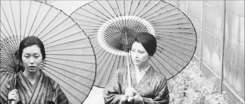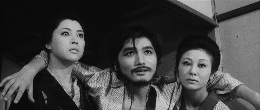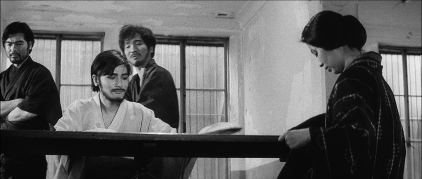 If Eros + Massacre isn't told like any other film I know, it also isn't photographed like any other film I've seen. Yoshida and his cinematographer Motokichi Hasegawa (who also lensed Yoshida's other movies in this vein, Heroic Puragory and Coup d'Etat) use widescreen not so much to fill our field of vision but to isolate and confine the subjects. Many shots are positioned with the camera pointing high, such that everyone's heads are at the bottom of the frame, and the vast expanse of the ceiling (or sky, or treeline) is above them, crushing them. There are no shots that make us feel like these are epic figures in history, stalking through scenes larger than life, because that would be antithetical to the movie's own ideas.