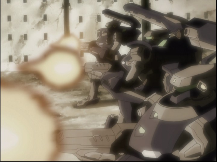 Renton and Eureka's emotional struggles are mirrored — in more than one sense of the term — in many other characters' relationships throughout the show, but most directly by another pair of characters on the other side of the plot fence: Anemone, an LFO pilot who is as vicious as Eureka is demure; and her controller, Lieutenant Dominic Sorel, a young man reminiscent of what Renton might be had he been drafted into the military and forced to tighten the waistband on his soul pretty quickly. Without the drugs that keep her manic (if functional), Anemone collapses into depression; she was once a happy person, before the military came along and turned her into a living weapon, and being reminded of what she once was only makes her feel worse. Sorel's feelings for her grow to the point where he, too, realizes there are things bigger than him that require he stick his neck out and abandon the comfort of the familiar. The growth of his character, and the history of those in Gekkostate, bring to mind a similar dynamic in Fullmetal Alchemist -- that of people who pledge their lives to uphold an ideal, only to discover it was the wrong ideal, and feel compelled to tear it down with their own hands.