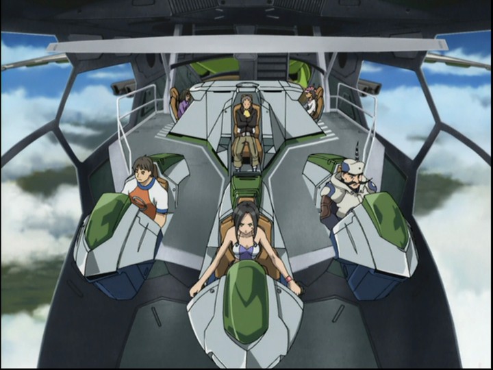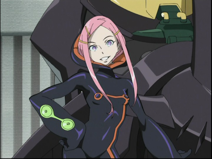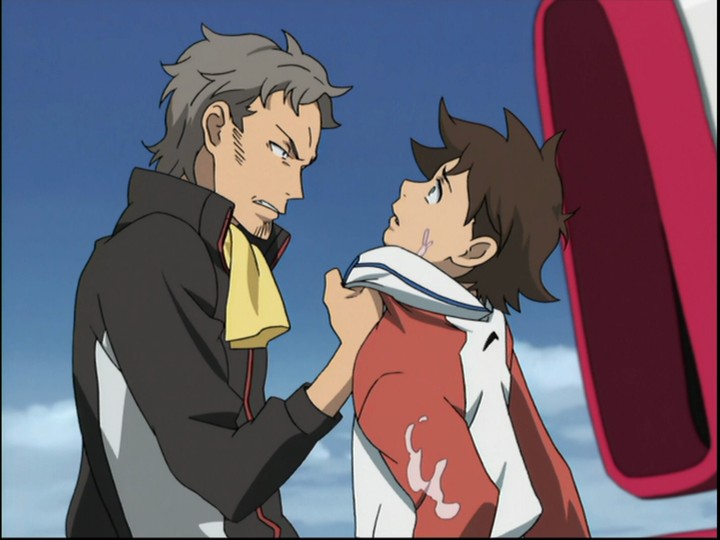 Most shōnen protagonists are somewhat one-dimensional, a "flat" character in the Dickensian sense of one who only exhibits a few basic (albeit prominent) emotional traits. Renton is a little more complex than that — he's defined mainly by his relationship to Eureka, but he gets some additional degrees of depth thanks to his connections to the other Gekkostate crew and his family (sister, father, grandfather). But the show wisely doesn't try to let him carry all the action; any hyperbolically adolescent emotion in large doses gets wearying, and so he's surrounded by and played off against a much broader galaxy of characters Not just people his age or younger, as per Eureka and her "family", but also Holland and his right-hand men and women, people whose development often feeds back into Renton's own and thus serve to deepen them both. I particularly liked Talho, the young woman who is nominally Holland's girlfriend and harbors reservoirs of jealousy for Eureka, but in time learns to put it aside and act as someone to be looked up to by others (mainly Renton) and not simply looked askance at.