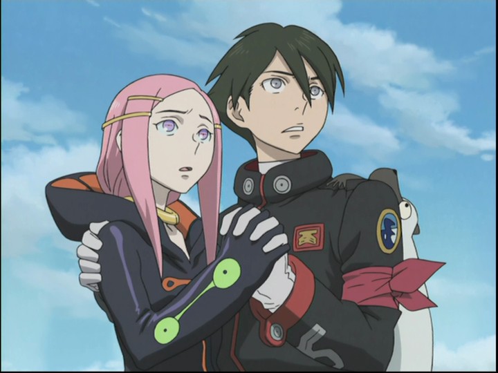 But this notion, and all the others that accompany it — and also the complex, history-rewriting motives of the state that tries to hunt down the Gekkostate -- are not things Renton is equipped to directly handle. Like many shōnen heroes, he's interested only in practice, not theory. He doesn't care about where Eureka came from; he only wants to know what he can do to make her happy. He will only find in time that the fact that her happiness and his are intertwined will be the source of as much misery as it is joy, but only through that process does he begin to find anything like the maturity to meet those problems head-on. What he discovers, on his own, is what Holland has been hammering into him all this time: nothing comes without sacrifice, and the most important sacrifice to be made is one freely chosen by oneself.
