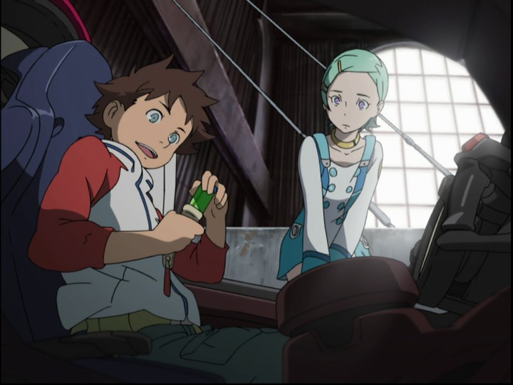 Another way both shows complement and contrast each other: the use of humor. When Evangelion brought in in Pen-Pen and all those other kinds of sidelong comic relief, it felt shoehorned in; it didn't feel like humor that evolved naturally out of the characters. With Eureka Seven, the humor can be equally lowbrow — Renton's pratfalls while swabbing out the hangar, or Sorel's struggles with Anemone's weird platypus-like pet — but at least it seems to be coming from a space somewhere near the characters themselves, and so it's both funnier and more relatable. Consequently, the show becomes that much freer to switch between comedy and drama as needed, in big part because both of those sides do the legwork needed to hold up their respective ends of the bargain.