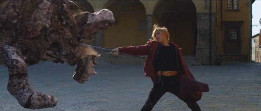The real problem, though, is how everything else in the movie has also been drastically downsized and shoehorned to match. Despite some well-chosen location shooting in Italy, the end result looks like a big-budget movie that was red-penciled down to a fraction of its cost days before it went in front of the camera. Too many shots look suspiciously sparse, as if the effects team was supposed to add crowd doubling but didn't have the money. The interiors at Central look so underdecorated, I wondered if the prop handlers had gone on strike that week. And so on. When people talk about this FMA looking like a filmed cosplay skit, they're not just talking about the outfits.