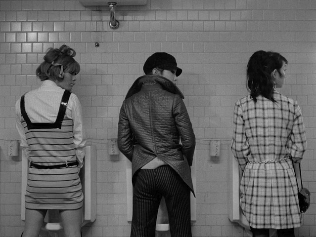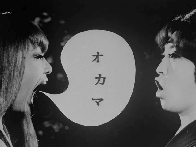 Things like this actually date Funeral Parade Of Roses a little more noticeably than the hippie-crash-pad counter-culture milieu it swims around in. In truth, the 1960s-era trappings of the movie feel a lot fresher and more striking than I thought they would. I suspect a big reason for that is because we're seeing Japan's 1960s counterculture, not the U.S./Western version of it. The general flavor may be the same, but the specific details aren't. English-speaking viewers who aren't intimately acquainted with those particular times and manners will experience a distancing effect that makes the whole thing feel less dated.