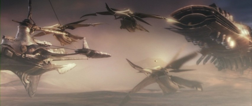 Directors — and dramatic artists generally — who want their stories to be Taken Seriously often commit the sin of forgetting that a story is supposed to be interesting on its own merits as, well, a story. We take something all the more seriously as a statement about our existences when it has some vital relevance to said existence in the first place, when it doesn't just feel like a blowsy lecture handed down from the pulpit. Maybe that's why what story we get seems so thin and why some of the action sequences are depressing in their amateurism — it's almost like Oshii built them that way to keep us from getting emotionally invested in the "wrong" parts of the story, because action sequences are frivolous distractions from the weighty stuff. Late in the film Kiakra and Skellig battle a bunch of giant robot-monster-things in a forest, and they discover the way to stop the monsters is by cutting the cables coming out of their backs. I half-expected them to discover at the end that their absent god was a computer and they could restore it by plugging it back in. (The ending we do get is very nearly that silly.)