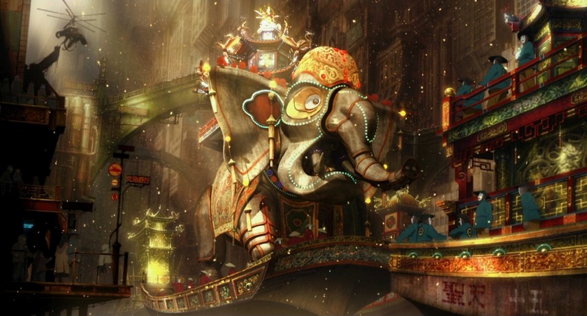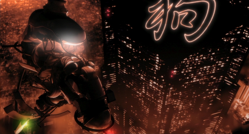 Cyberpunk is essentially noir in a plugsuit, and noir itself is mainly atmosphere punctuated with bursts of violence and hard-bitten cynicism. On that level, on the level of mere mood and texture, Innocence is right up there with Blade Runner, the movie Oshii clearly wanted both this and its predecessor to be most like. The rundown, gloomy streets are spattered with neon; layers of technology have been built atop each other without regard to how they'll coexist; the spires of skyscrapers suck the sky and gleam with traffic. It is something of a cliché to praise any of Oshii's films for being good-looking, but Innocence is so consistently gorgeous from end to end that it seems the fulfillment of yet another cliché, that what a movie can lack in story it can almost always make up for in sheer spectacle and intensity of vision. (Much of the imagery is CGI, but stylized in such a way as to seem a brother to the hand-drawn components and not a cousin once removed — something Production I.G has always been good at.)
