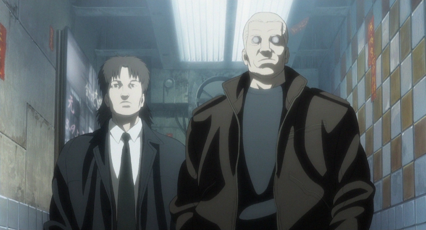 Noir is as much about a certain kind of hard-bitten character as it is about hard-boiled atmosphere, and to fill that role Innocence paints Batou as a noir antihero, top to bottom. When he's finished with his headlong charging and outbursts of violence for the day, he retires to his lonely little apartment, where the only thing waiting for him apart from his recliner is his pet, a loving basset hound (another recurring Oshii trademark). Togusa, the family man and by-the-book officer, provides the same straight-world contrast here that he did in the TV series and elsewhere. He has little patience either for Batou's two-fisted work style or for the more esoteric philosophical implications of their mission, but he is hard-pressed to push back against either one, especially after it's Batou's very headlong attitude that saves his existential bacon.