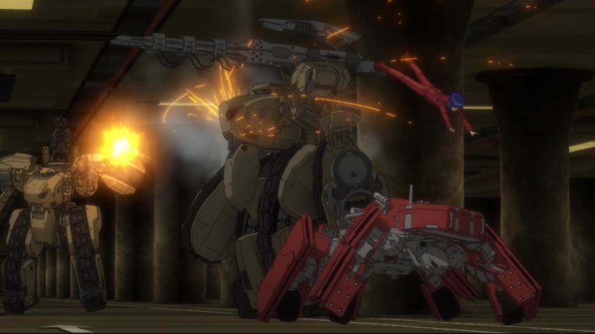 Much of the intricate plotting of the first ARISE, or of any of the GITS installments at all, has been shelved in favor of one set of action scenes stacked back-to-back with another. A fight between multiple war machines in an underground garage (with Kusanagi commanding a Logicoma) is excellently staged, and there's all sorts of antics involving Kusanagi on a motorcycle in both meatspace and cyberspace. It's all quite well done, but in the end it has the flavor of marking time — and there are times when it becomes flat-out silly, as when the Logicoma starts leaping across rooftops and swinging from a tether as if in imitation of a certain other spider-themed character in popular culture. I wondered if that was this installment's idea of a joke, but the way humor works best in a story like this — or any story, really — is when it grows naturally out of the people and the goings-on they're involved in, and not when it's imposed from above.