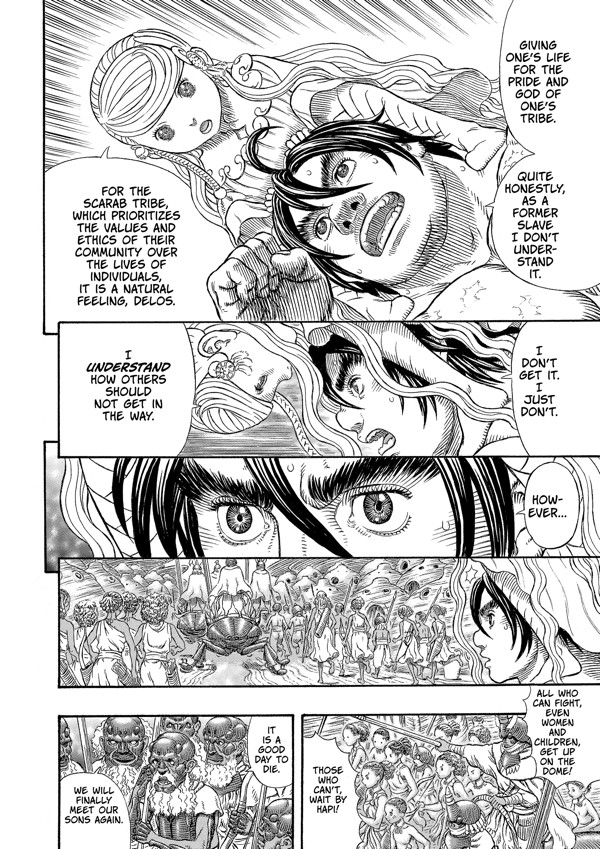 The two happen across a village of what could be described as beetle-men, humans with insectlike carapaces that make some of them look like the fellow on the cover of Tool's 10,000 Days album. Gohra and Prome are greeted with hostility: after all, they look like the dreaded pure-breed human who drive giant biological war machines. Gohra insists on the right to a duel with the village's second-in-command, something he's good at since he was a gladiator in a former life. The two tussle, and gain the sort of mutual respect that authors love to give their characters after they have come within an inch of pounding the stuffing out of each other. From that, Gohra and Prome are permitted to join the fight and unveil their weapon — an Ultraman-esque giant, complete with Gohra's own luchador wrestling moves, who goes forth to grapple with the machines of destruction.
