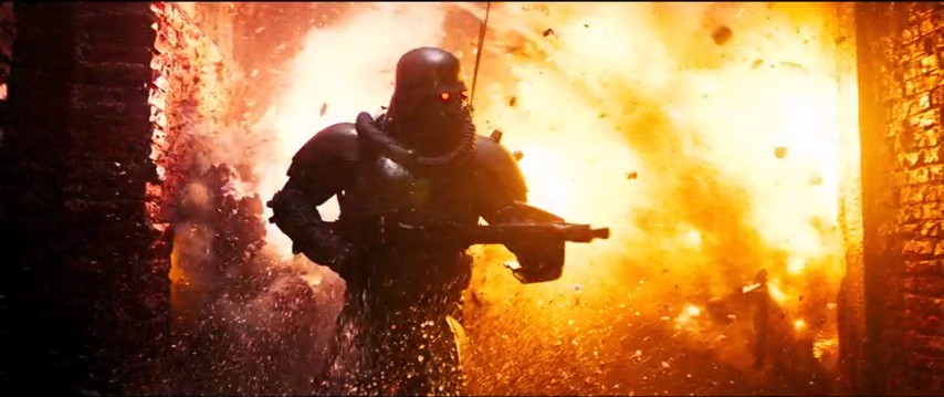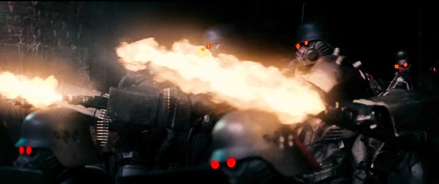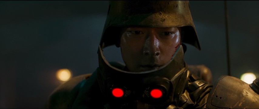 Fans of Jin-Roh will have little trouble mapping back everything they see here to the original. The plot tracks fairly closely with it, and there's no end of familiar images from it hoisted and converted into live-action more or less as is. To wit: the soldier's grotesque super-armor, or the staircase-set design of the sewer lair, or a moment when the glowing red eye sockets of the Unit's masks seem to leave trails, or even the design of the film's title card. The problem is that reproducing those things alone, or even in concert, doesn't reproduce what made the original special.