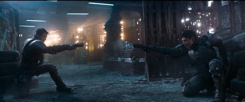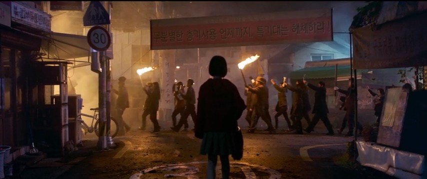 It's not as if Illang is incompetent. In the space it inhabits, it works decently well. Not the space of live-action anime adaptations, but rather as the latest of the professional-looking, stylized action thrillers that have been a staple of the South Korean film industry since the late Nineties from Shiri on. Its near-future atmosphere seems inspired by productions like Children Of Men, where power cuts are commonplace, trash covers every streetcorner, and all the windows have steel mesh over them.