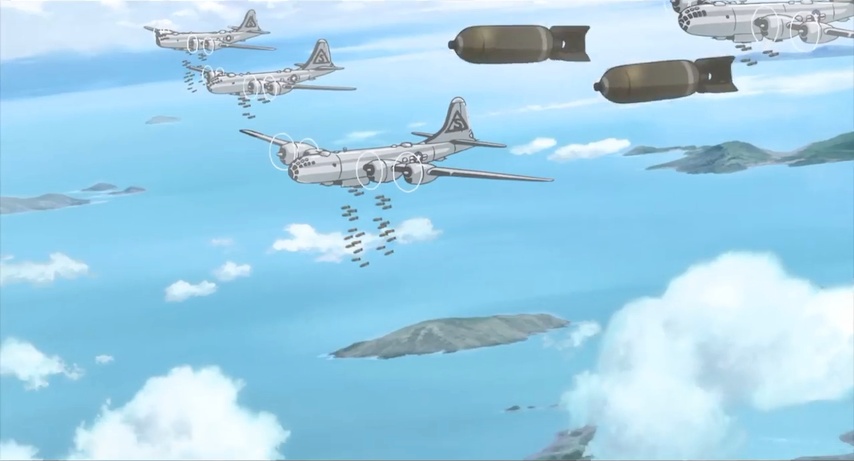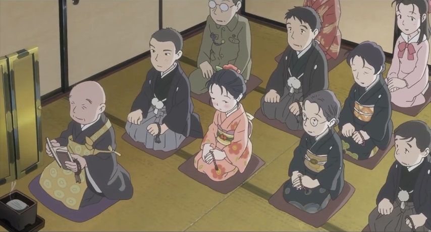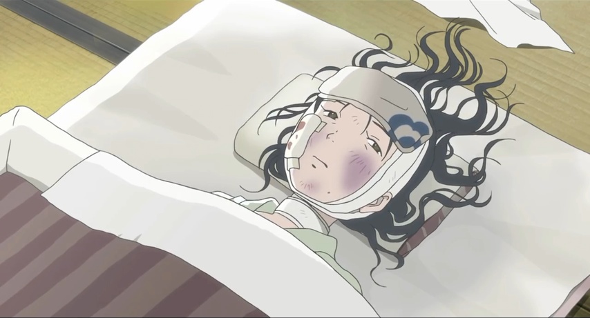 Gradually, almost without us noticing, the story closes in on Suzu and her family, both sides of it, from different directions that ultimately converge. The war becomes less about mere material privation and more about the threat of death. Air raids go from being routine drills to frightening endurance tests. The possibility looms that Shūsaku may end up being taken from his safe desk job and pressed into active duty. Then one day Suzu makes a horrible miscalculation involving a delayed-action bomb that landed next to a road. She loses part of her right arm, but far worse, she loses her niece, Harumi — Keiko's daughter.