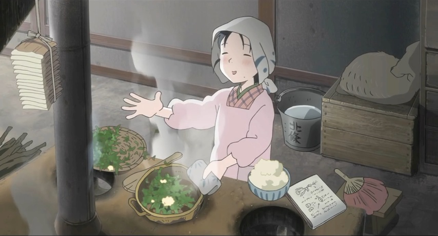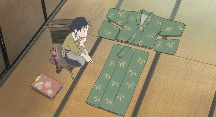 Most of the first half of In This Corner is episodic, an accumulation of many well-observed details throughout Suzu's life. But the movie works above and beyond just being a time capsule; it takes its details and regards them by way of a story that leverages their presence well. I mentioned the way Suzu improvises meals, but there's also things like the way she's motivated to wear something more "fashionable" (Keiko's words), and so she repurposes a kimono into workaday clothes.