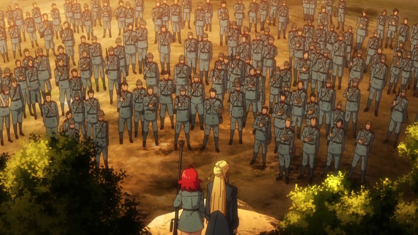 Again, this isn't a bad setup, and for the first couple of episodes (and apart from some annoying injections of fanservice), I thought Izetta was on to something. Specifically, I thought Izetta, the character, would have to choose between becoming a weapon of total war and remaining true to herself. There's a few stabs in that direction, as when Izetta gets staged for a photo-op to demonstrate her powers, and feels uneasy about the whole way things are being played out. In the same vein are a few moments where Izetta is forced to confront the humanity of the people she's being tasked to fight, that they are more than just targets to be picked off but people with lives and destinies of their own.