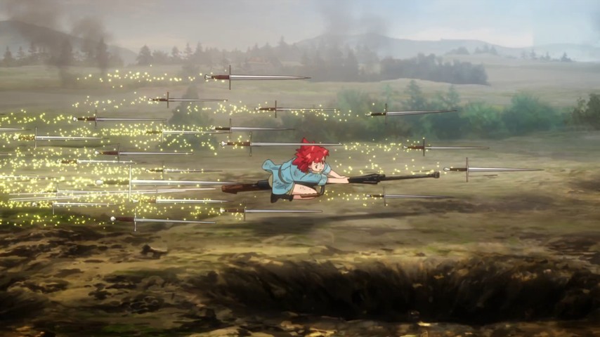 Izetta is devoted to her friend first in all things. Translation: she doesn't want to sit out the war effort, not when she can use her enchantment to transform swords and lances into anti-aircraft and anti-tank weapons, like some militarized version of "The Sorcerer's Apprentice". It works smashingly well — not just because it puts Germania on notice, but because Eylstadt's own soldiers are now that much more inspired by a literal and figurative local legend. But the battle isn't so easily won: Izetta's powers have their limits, and Germania has not only started to figure them out but surpass them with a witch of its own.