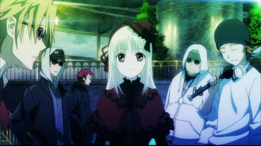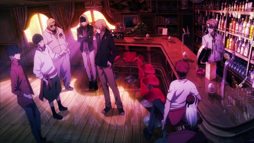 This fellow is Kurō Yatogami, a member of an outfit known as "Scepter 4", led by the "Blue King". Turns out a group of seven Kings, each identified by a different color and with a different variety of power, have been pulling all the strings in Japan for quite some time. The other night someone who looked a whole lot like Yashiro, and who proclaimed himself to be "the Colorless King" (I wonder now if the staff was reading any David Foster Wallace), shot a man dead on a rooftop and bragged about it to all the world in a blurry cellphone video. Kurō ("Black") is determined that "Shiro" ("White") is the killer, but through a combination of trickery and sincere pleas for common sense — never mind that by the logic of any story, the former should negate any appeals to the latter — Shiro gets Kurō to put aside his vendetta and help him find out the truth.