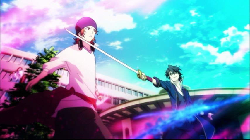 K is set in some unspecified future time, when most everyone enjoys an even higher level of technological comfort than we do now, e.g., cleaning robots are common. White-haired, chipper Yashiro Isana attends high school, and his life is normally a pleasant routine of forgetting his school-issued PDA, begging off the largesse of his classmates, and taking lunch on the roof. Then one day all of that is swept away when he's sent to get fireworks for a school celebration and ends up being marked for death by a cold-eyed young man wielding a sword.