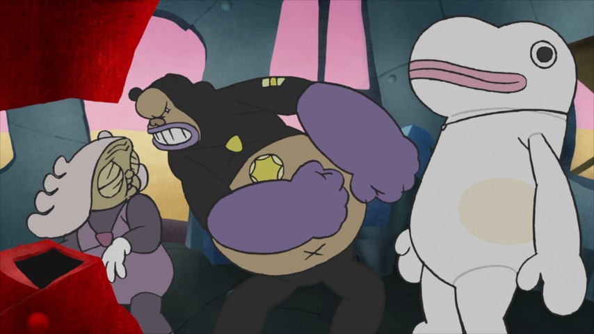 The largest part of how the show makes it seem effortless is through its visuals. Kaiba looks like a children's show — not in the sense that it's aimed at children, but in the sense that it feels like it was made by children. Everything has the blobby, simple-lined design of a kid's drawing, but is also invested with fearless and visionary imagination. One of the gizmos used by the characters allows them to probe someone else's memories by opening a physical portal, which they can step through, and for each character the metaphor of memory is different: sometimes it's a library, sometimes an LP collection, and so on.