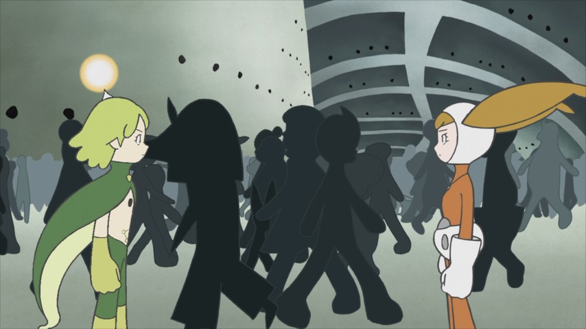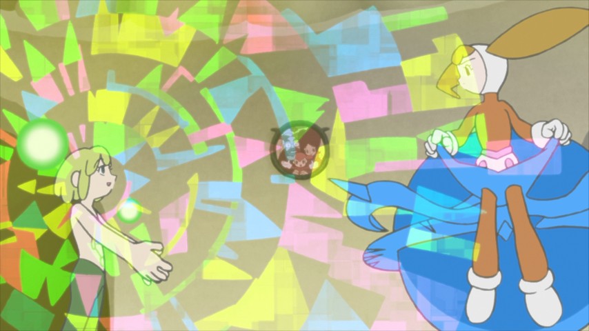 Most of the first half of the show is about Warp's travels from world to world in various bodies — male, female, and genderless alike. It's reminiscent of properties like Galaxy Express 999, where at each stop along the way Warp encounters people who embody different aspects of the story's universe of interchangeable bodies and souls. Some are whimsical, but a few are heartbreaking; the best, or saddest depending on your view, has Warp encountering an old woman whose sons are convinced she's hiding a great treasure courtesy of their deceased father. Warp uses a piece of technology common to that world, one that allows a user to step into the memories of another as if browsing a library's stacks, and discovers the truth: there is indeed a treasure, but it's not what the boys think it is, and for this they end up wasting their lives in more than one way.