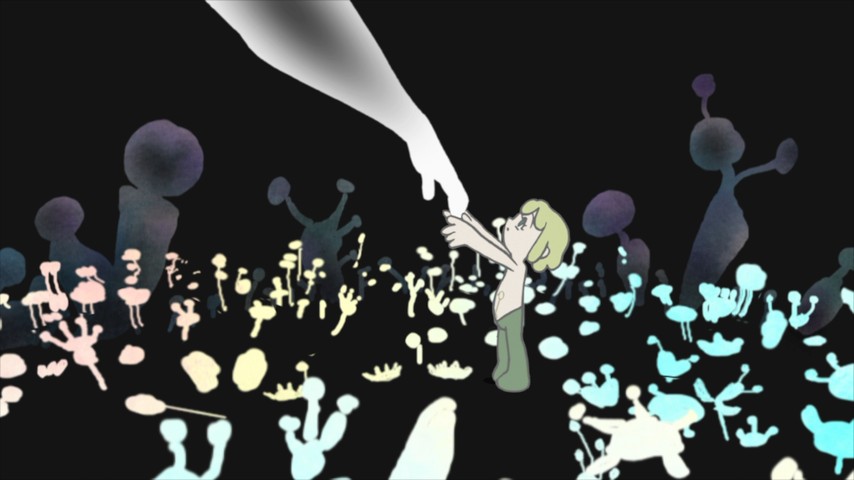 Yuasa's work has always drawn on things far outside of whatever else is going on in anime. Here it feels like one of the possible influences was the experimental animation of Faith and John Hubley, especially their epic-length film The Cosmic Eye. I was also reminded of Osamu Tezuka, both in conventional ways (the character designs) and when he was at his most unfettered and radical (the psychedelic excesses of Phoenix).
