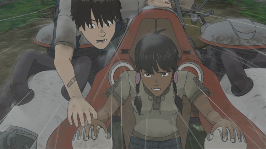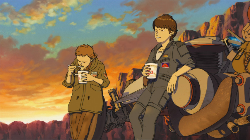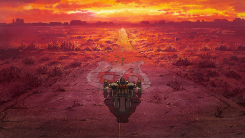 Takeru's determination to find the girl in the picture leads him to dragoon his handyman friend Bismarck into helping him find one of a number of escape-pod rockets concealed around Eden. This they pilot back to Earth, with Takeru's lunar buggy (and a case of Cup Noodles, ha ha) secreted away in the cargo hold. It's at this point Freedom turns, hilariously, into an homage to road pictures --something I chalk up to screenwriter Dai Sato, whose fondness for American popular culture could also be seen in Eureka Seven when he named the main character "Adrock". Here, it's one part Mad Max (ruined landscapes), one part Easy Rider (especially when Takeru and Biz encounter a busful of friendly hippie types), and one part of what I guess could be called "post-idyllapocalypse", where despite everything haven fallen apart, people still manage to eke out a life, save the pieces, and keep hope alive. I suspect audiences hardened on how a collapsed future necessarily entails roving gangs of loot-'n'-shoot marauders will giggle condescendingly at this part of the story, but I found the change-up refreshing, and I suspect everyone is likely to get a laugh out of the shot of Takeru and Biz peeing into the Grand Canyon.