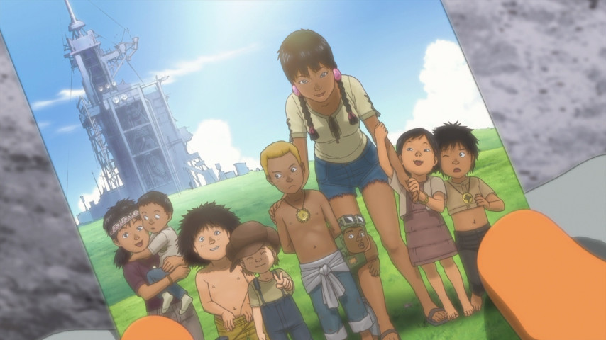 Where the story goes from here, though, is both inspiring and frustrating. Inspiring in the abstract, because it's heartening to see something, anything, that encourages us to lift our eyes from the mud and look up at the stars. But frustrating in the specific, because the whole way Freedom arrives at its climax is through one annoying contrivance after another. I'm not talking about the way Takeru inspires Ao and the others to help build a rocket to send them back to the moon; the show's already established such absurd feats are part of the territory. I'm talking more about what happens afterwards, which is driven by plotting so foolish it's barely a step above characters pulling off rubber masks and laughing. Most badly fumbled is the motivations for Eden's repressive administration. It's one thing to say that tired old men who run things with an iron fist exist in real life, but just dumping them as-is into a story doesn't automatically make them worthy of being a motivating force, or a good component of a work of fiction.