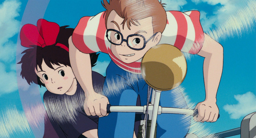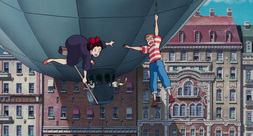 The film's biggest weakness is its ending. It's a mess involving Tombo and a downed airship, one where Kiki has to kick her powers back into gear in order to save the day. From a story-construction standpoint, it works, but the tone of the whole thing feels wrong — it's as if Miyazaki got uneasy not ending the film with a bang, and so he resorted to a big set-piece action climax. Maybe there could have been something like Tombo participating in a race with one of his wonky flying machines, and Kiki flying shotgun with him, helping out when his bike chain snaps. But there's no denying what we do get is thrilling; from a technical perspective, it's a marvel, as the Ghibli team find one opportunity after another for suspense or laughs (or sometimes both at once). And the way the film puts a bow on all that's happened — something that lasts through the end credits, so stick around — leaves us inclined to think: You know, I get the feeling that girl's going to do just fine. Actually, from what we see, she already has.