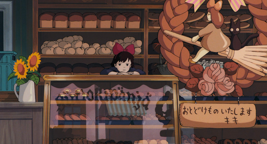 Glum and dispirited with the minimal options available to her, Kiki lucks out when a bakery-shop owner discovers a customer left behind her baby's pacifier, since Kiki is able to ferry it to the woman in a fraction of the time it would take to chase after her on foot. The baker, Osono, a merry and stout-hearted sort, offers Kiki the use of her attic and a suggestion about a possible line of business: Why not run a delivery service? The sheer novelty of the idea kicks Kiki into higher gear: it's not that she minds helping out in the bakery (especially since Osono has a baby on the way), but anything she can do to put her powers to use ought to be a net boon.