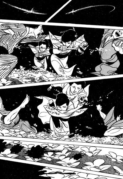 Material like this is stock-in-trade for author Koike, he who gave the world two other classic manga stories of revenge and bloodthirst. One was Lone Wolf and Cub (which ran contemporaneously with Snowblood), the story of a father-and-son pair of avenging assassins that cut a swath of its own through Japanese and Western popular culture alike. It, too, used its storyline as a way to examine the injustices of the Tokugawa shogunate, one that kept peace in Japan for two centuries but at no small social cost.