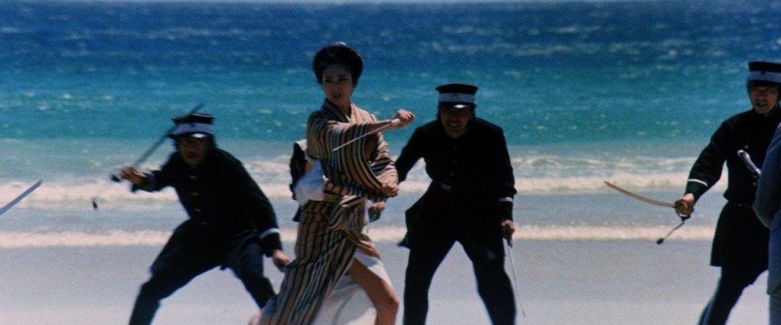 It only seemed natural, then, for Kaji to trade in her switchblade for an umbrella sword, and swap her bellbottoms and modish floppy hat for a kimono. The period and the trappings may have been different, but the role echoed so many others from her career: a fierce young woman, an outsider several times over, speaks truth to (often illegitimate) power by way of violence. It helped that she was paired back up with director Toshiya Fujita, helmer of two of the Stray Cat Rock films, someone who already understood how to use Kaji's steely screen presence.