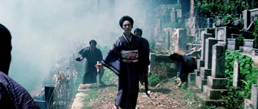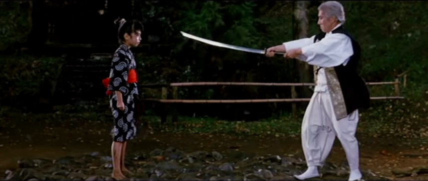That "him" turns out to be a "her", named Yuki for having been born on a night of heavily falling snow. Raised by a Buddhist monk, a stern taskmaster who schools her in the martial arts, she ventures out into the world armed only with her body and — par for the course in these kinds of stories — a gimmick weapon: a sword concealed inside the shaft of the parasol she carries everywhere.