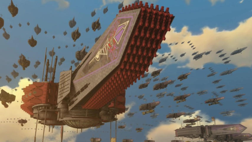 Among the sky pirates is the sprightly Fam of the title — full name "Fam Fan-Fan", which gets easy laughs every time it's trotted out. Fam and her more demure-spirited companion Giselle hijack ships for a living, ensnaring them in a web of lanyards. They have no allegiances to any particular nation or army, but they have a code of sorts, and that code includes helping others in distress. When they discover the Federation of Ades is planning a surprise attack on two princesses of the Kingdom of Turan, Fam and the others drop in on the war party, uninvited. The princesses — the elder Liliana and the younger Milia — are taken aback by these ruffians offering them safety in exchange for their ship, but if there's anyone capable of faking out a Federation battle fleet, it's sky pirates.