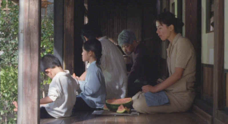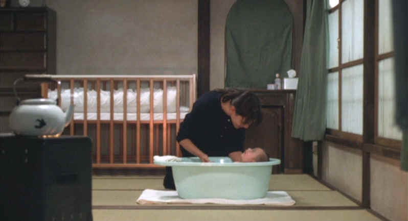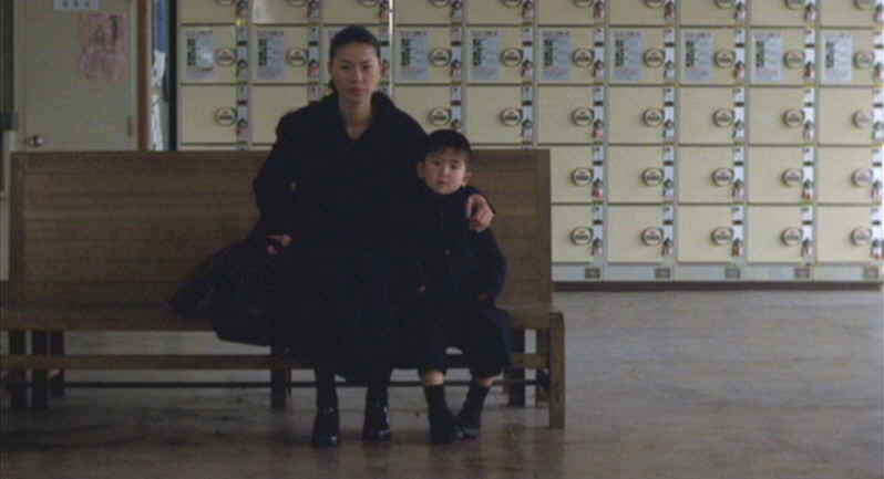 What's curious about these tender early scenes is how Kore-eda films them with great distance and coldness. There are no closeups, only medium shots at best. Shots begin and end in total darkness. We do hear peoples' voices — but they're also distant, muffled, as if from another room. They are receding over the horizon even as we first meet them, for reasons that become clearer as we go on. The acting is likewise subdued — something that landed with all the more contrast for me, since the last time I'd seen Esumi was by way of her mannered "Cinematic Kabuki" performance in Seijun Suzuki's Pistol Opera. And, finally, there's the way the camera lingers a little bit whenever the husband leaves the shot, as if to say: Get used to him being gone.