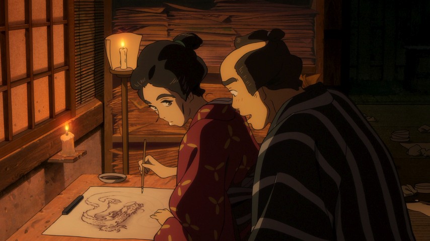 The film, adapted from Hinako Sugiura's manga (not yet available in English) is about a year or so in Hokusai's life from the point of view of his adult daughter, O-Ei. With Hokusai's wife having stepped out of the picture, O-Ei has ended up in the position of being her father's agent, creative collaborator, and life janitor. She ensures he continues to have work, she helps him complete projects when they go unfinished, and she keeps him from landing himself (and, by proxy, herself as well) in the gutter.