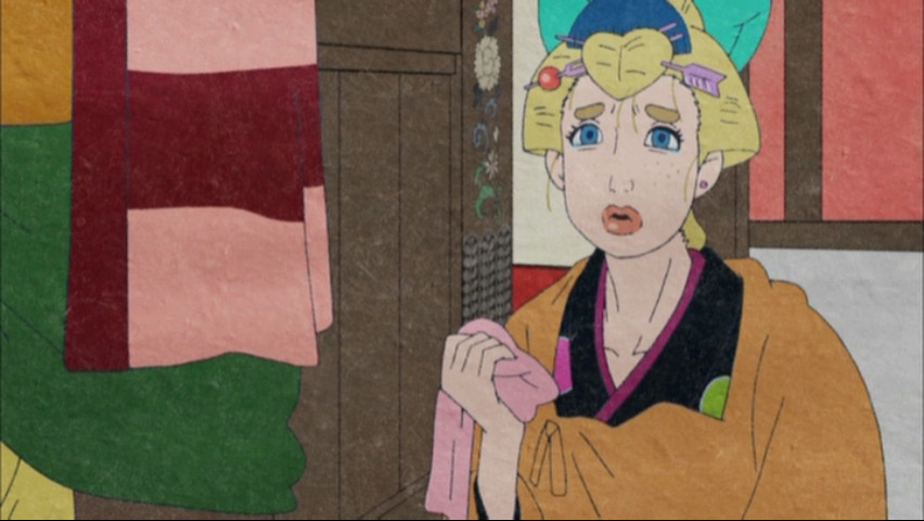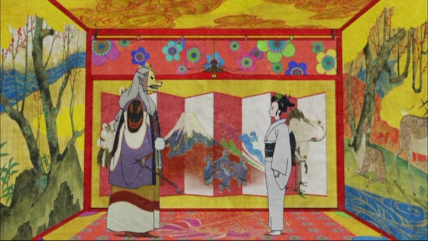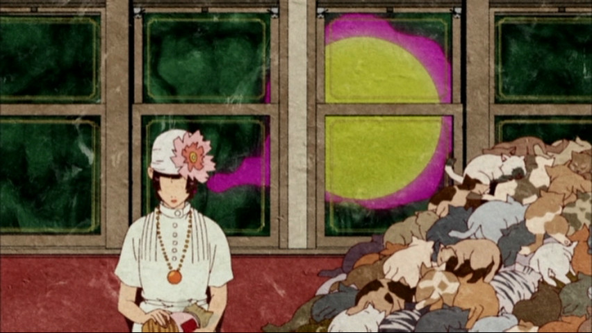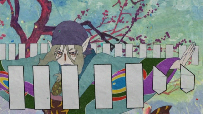 But even if the show falls short on that one level, it succeeds on so many others that to slight it for not having a robust main character seems like nitpicking. On a design level, certainly, it's a masterwork: it doesn't even bring to mind other anime, but rather the psychedelic visuals of Western artists and designers like Peter Max, Seymour Chwast, and Milton Glaser. Sometimes this road-to-excess approach is off-putting — remember how hard Gankutsuou was to watch at times? — but it's also a strong reminder of how the best arts enrich themselves not simply by bearing in mind their predecessors and building on them, but by drawing on things that are as unlike them as possible.